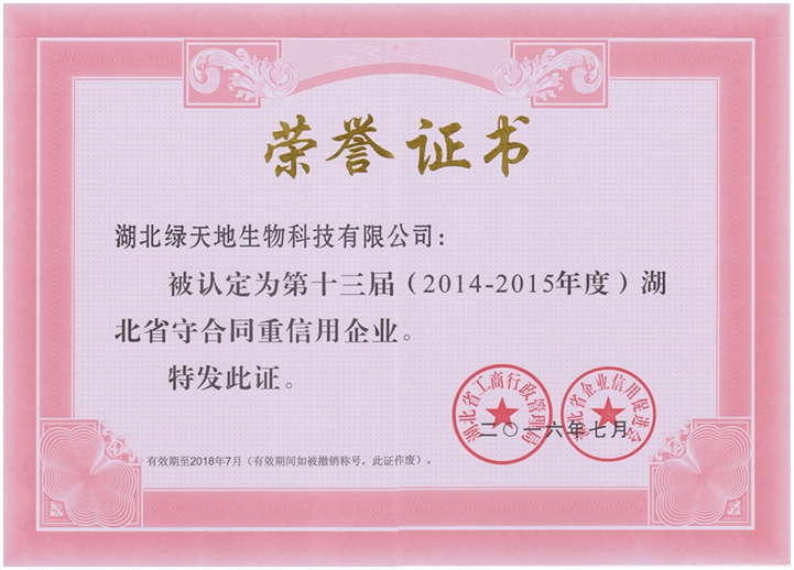 公司獲評為湖北省第十三屆守合同重信用企業(yè)